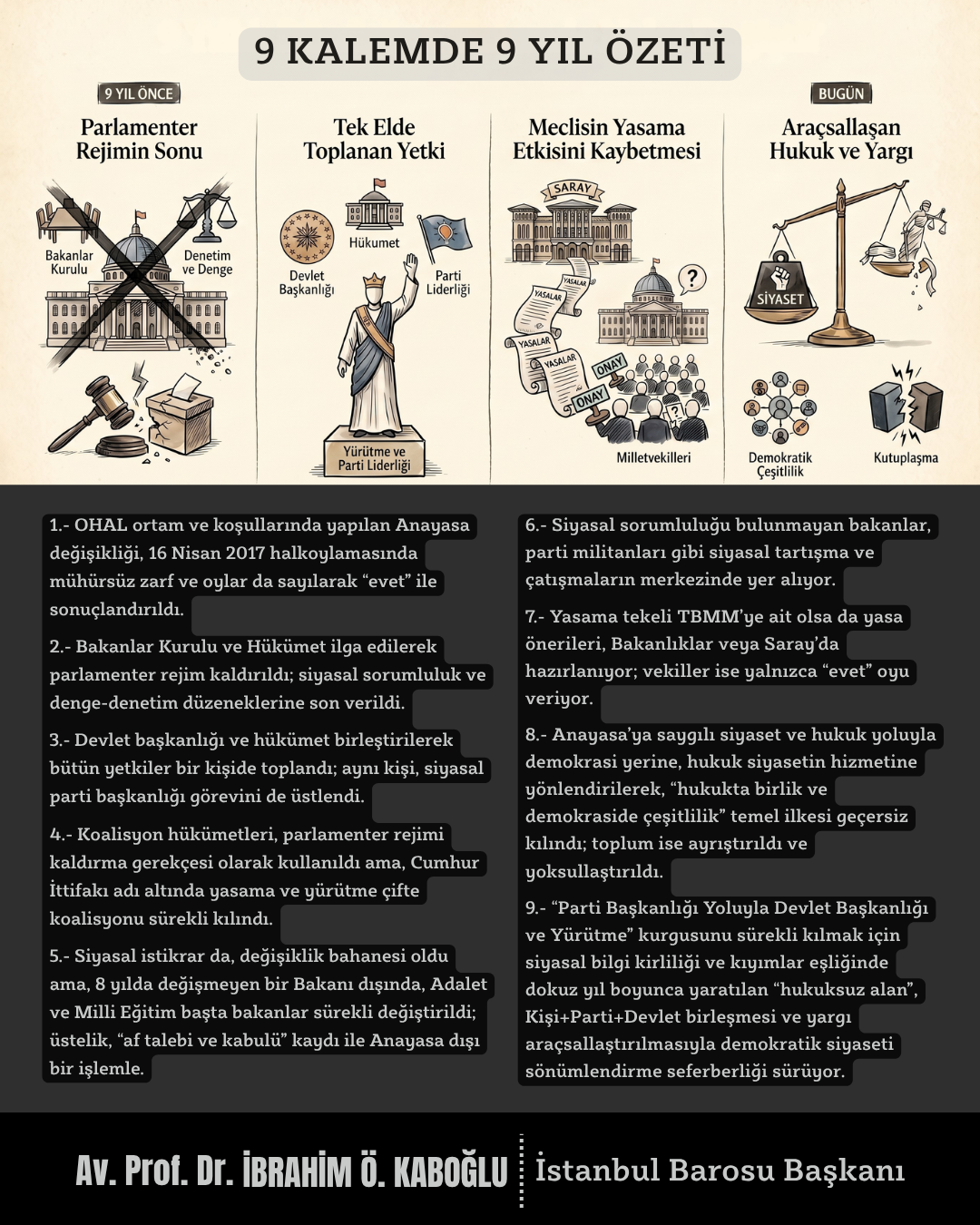 2017 kurgusu 9. yıl özeti: Halkın güçlü demokratik iradesi karşısında sürdürülemez olan “ya hep”çi kurguyu “her zaman” için geçerli kılma ereğinde yargıyı demokrasiyi sönümlendirme aracı olarak kullanma yılı. (Gazete Pencere, 16 Nisan 2026)